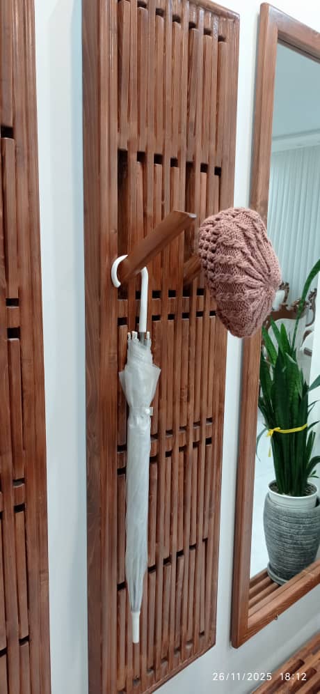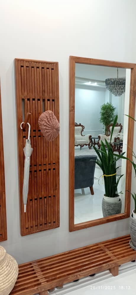 ست آینه و رختآویز چوبی، ترکیبی هماهنگ و کاربردی برای ورودی یا فضای نشیمن است. آینه با قاب چوب طبیعی، جلوهای گرم و زیبا ایجاد میکند و رختآویز همراه آن امکان نظمدهی به وسایل روزمره مانند مانتو، کیف یا شال را فراهم میسازد.